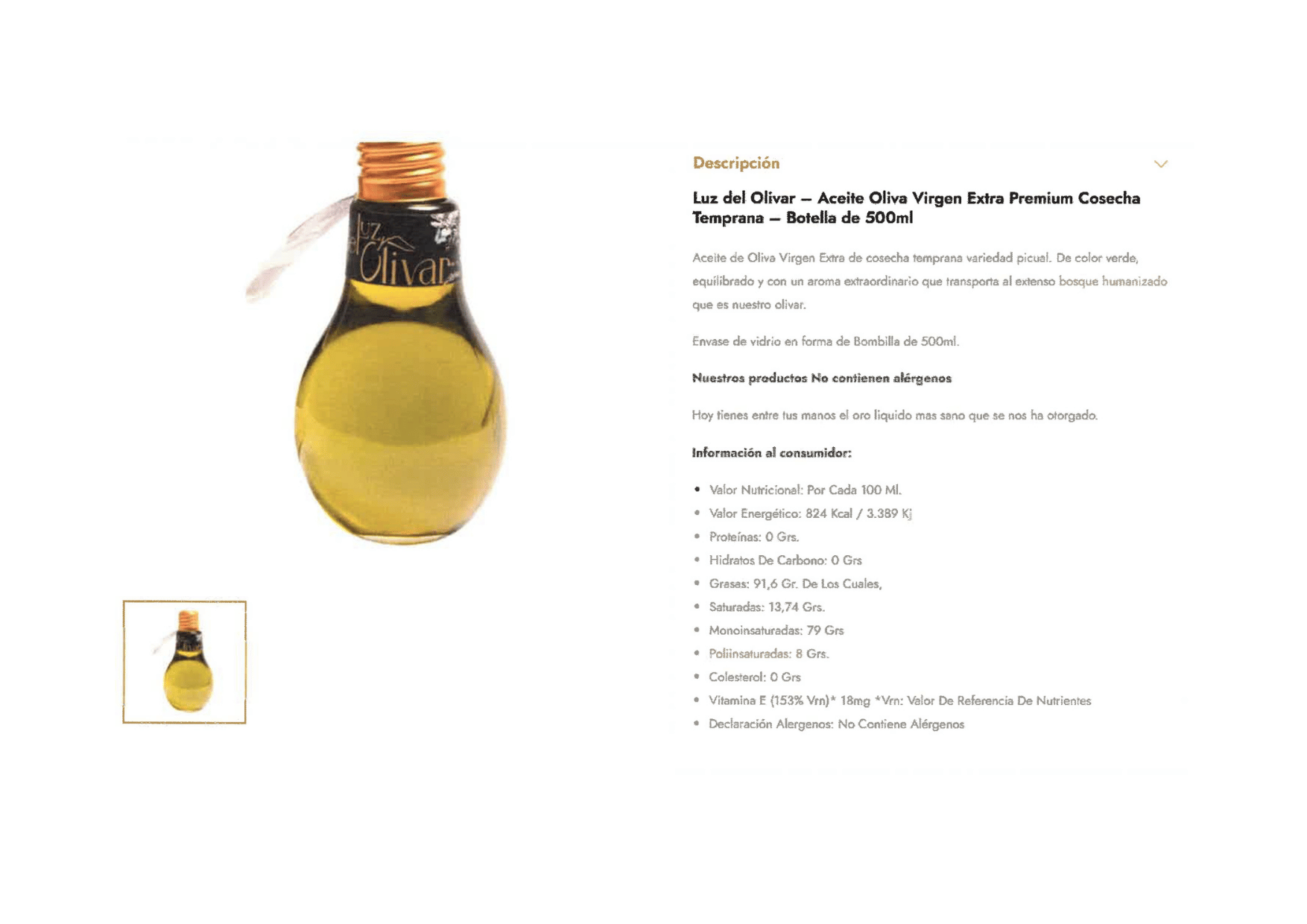 El Cosecha Temprana Ecológico Bombilla 500ml de Oliva Sur Natural es una joya de la agricultura sostenible. Elaborado con aceitunas ecológicas recolectadas al inicio de la campaña, ofrece un aceite de sabor intenso, frutado y fresco, con un característico toque verde y aromas herbáceos. Su innovador envase en forma de bombilla refleja la fusión perfecta entre naturaleza, diseño y calidad premium. Ideal para los amantes del buen aceite y del respeto por el medio ambiente.
