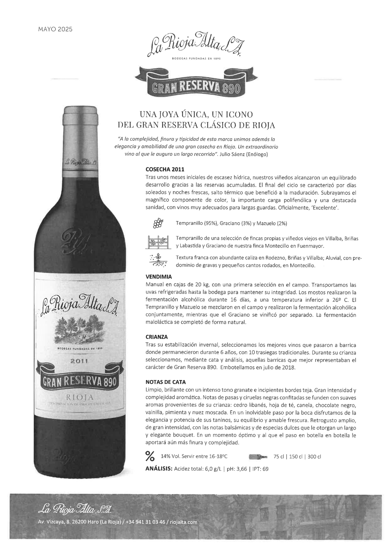 Gran Reserva 890. Botella 75 cl.
