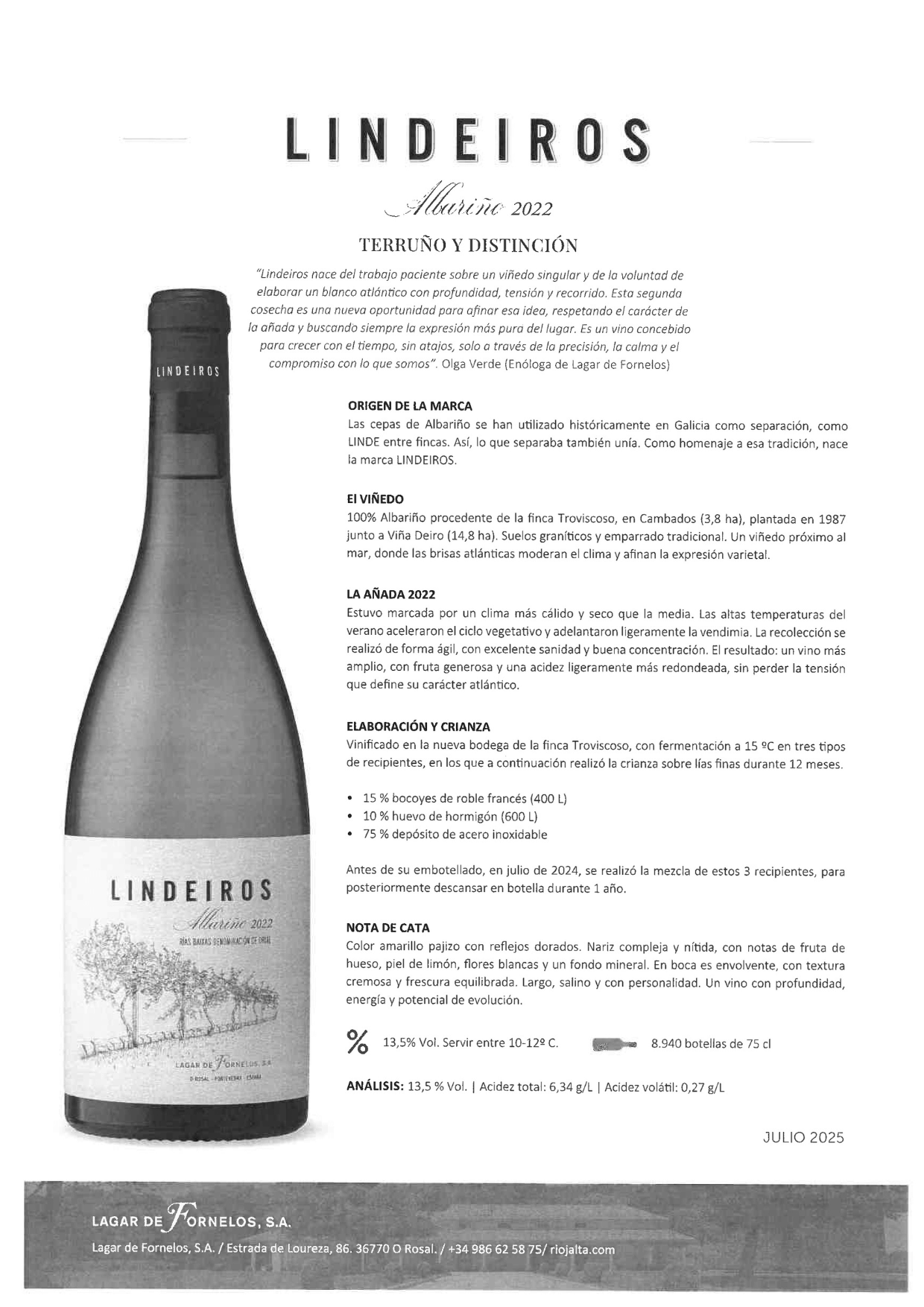 Lagar de FornelosEl Lindeiros es un vino blanco de la D.O. Rías Baixas, elaborado 100 % con uva Albariño. En nariz destaca por sus aromas frescos a manzana, melón y flores blancas, con un delicado toque salino propio de su origen atlántico. En boca es equilibrado, elegante y persistente, con una textura carnosa y una acidez perfectamente integrada. Ideal para acompañar mariscos, pescados o arroces.