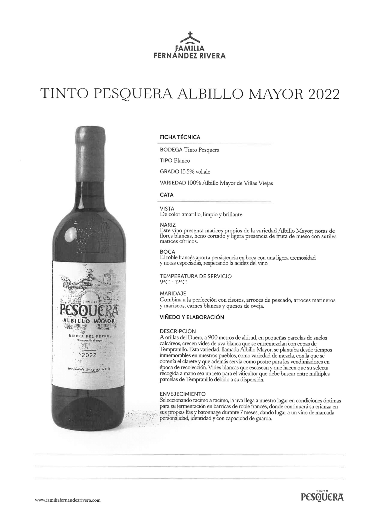 PesqueraEl Tinto Pesquera Albillo Mayor 2022 es un vino blanco de la D.O. Ribera del Duero, elaborado 100 % con la variedad Albillo Mayor. De viñedos sobre suelos calcáreos a gran altitud, muestra aromas de fruta de hueso, flores perfumadas y un fondo cítrico y salino, con una textura cremosa y un final largo y elegante. Ideal para maridar pescados a la plancha, arroces o momentos especiales.