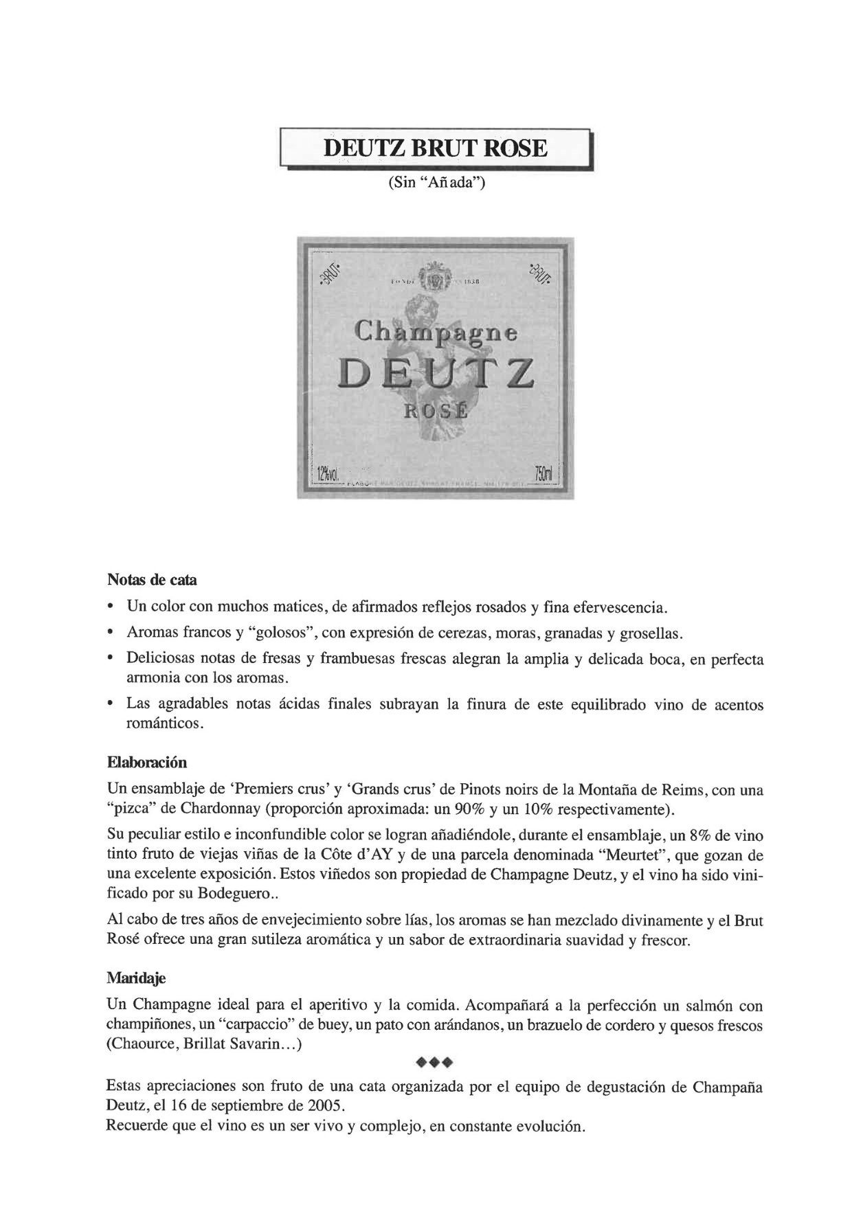 Maison DeutzEste espumoso rosado de la región de la Champagne combina aproximadamente un 90 % de Pinot Noir y un 10 % de Chardonnay, con un toque de vino tinto para lograr su color y carácter. Presenta un tono salmón brillante y nariz de frutas rojas frescas como cereza, frambuesa y grosella, junto a notas florales y sutiles toques tostados. En boca es elegante, de cuerpo medio, con burbuja fina, acidez vivaz y un final persistente. Ideal para aperitivos o celebraciones especiales.